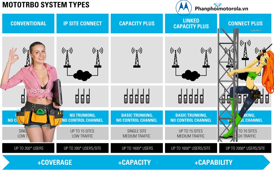 Chế độ mở rộng phạm vi sóng bộ đàm qua kênh trực tiếp (1 tần số) cho phép hoạt động lặp lại trên kênh máy bộ đàm đơn giản. Là giải pháp Motorola giúp tiết kiệm chi phí sử dụng tần số
